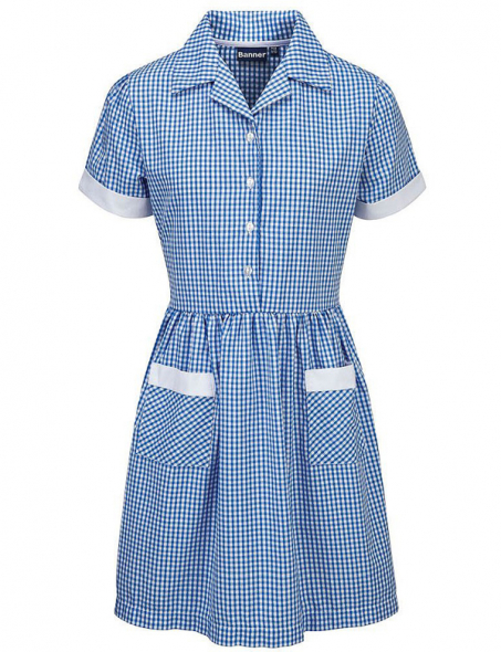 Item: Button front corded gingham dress with contrast white trim on sleeves and pockets.