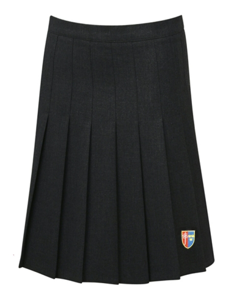 Item: Eco-Skirt with stitched down knife pleats and Bishop Thomas Grant logo on pleat
