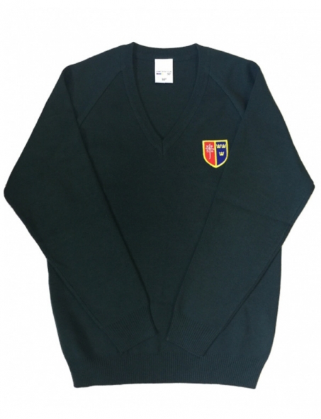 Item: Bottle Green Pullover with Bishop Thomas Grant Logo. Pullover is made up of 50% acrylic and 50% cotton giving both comfort and fantastic durability