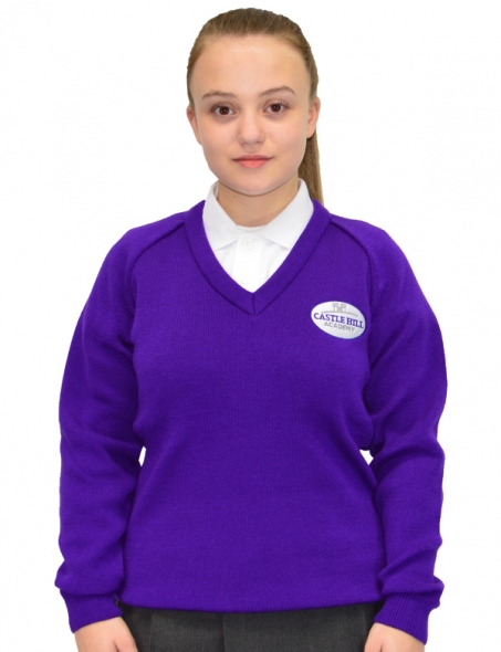 Item: Purple V-Neck Courtelle Pullover with Castle Hill Academy logo
