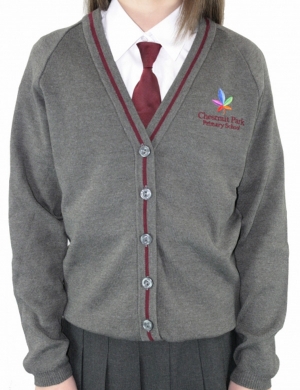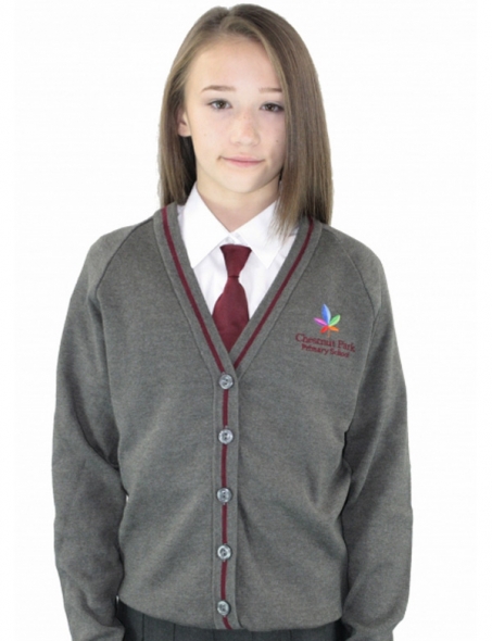 Item: Grey Performa 50 unisex cardigan with maroon stripe and Chestnut Park logo. These cardigans offer excellent shape and colour retention and are made up of 50% cotton and 50% acrylic. They are even washed during manufacture for extra softness.