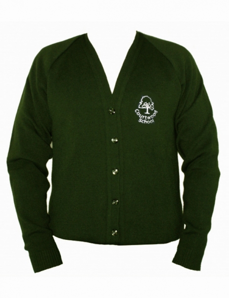 Item: Bottle Green knitted Courtelle cardigan with Courtwood logo