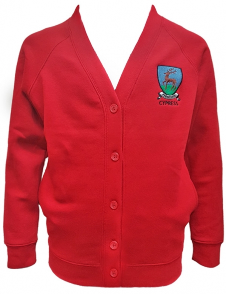 Item: Red button-down sweatcardy with Cypress Primary logo