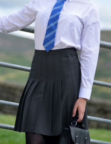 Item: Eco-Skirt with stitched down knife pleats. 100% of the polyester used comes from recycled plastic bottles.