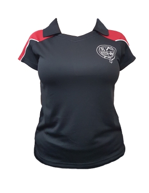 Item: Black and red lightweight girls polo shirt with printed de Stafford logo