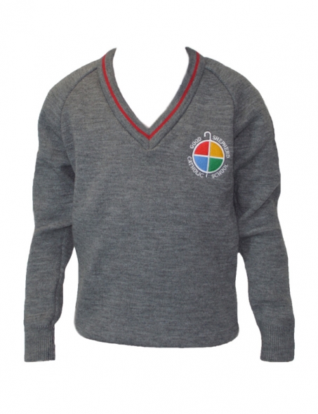 Item: Grey V-Neck Courtelle Pullover with Red stripe on neck and Good Shepherd logo