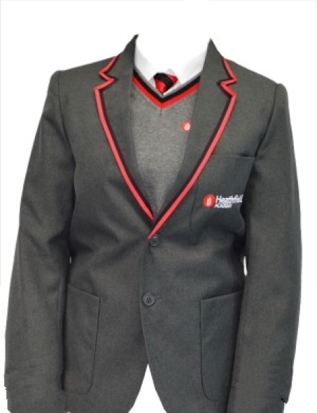 Item: Grey blazer with Black/Red tape and Heathfield Academy logo