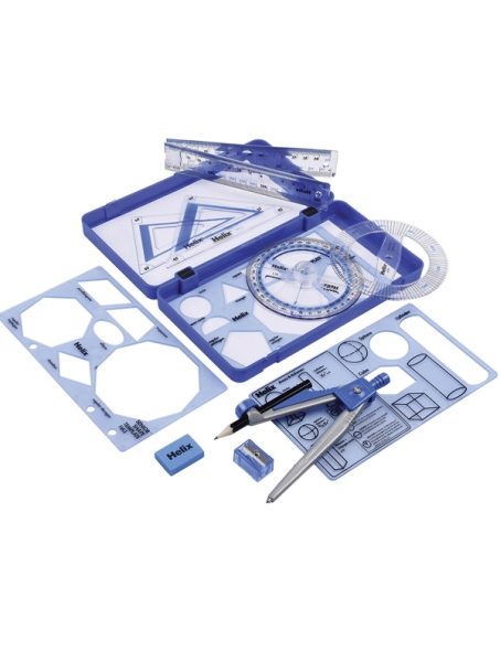 • The Helix Maths Achiever set contains a patented 30cm folding ruler, angle measure, pie chart template, sharpener with anti tamper screws, eraser, 2 shape templates, self centring compass with 9cm pencil and safety point all of which is presented in a blue case.