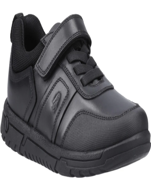 The Sutton is a tough and practical senior boys' black school shoe, featuring easy touch fastening and a padded collar for all-day comfort. Its textured toe guard and hard-wearing outsole offer extra durability for busy school days.