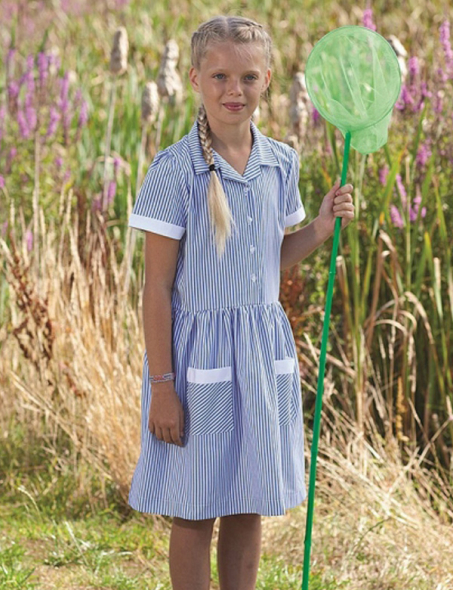 Item: Button front corded stripe dress with contrast white trim on sleeves and pockets.