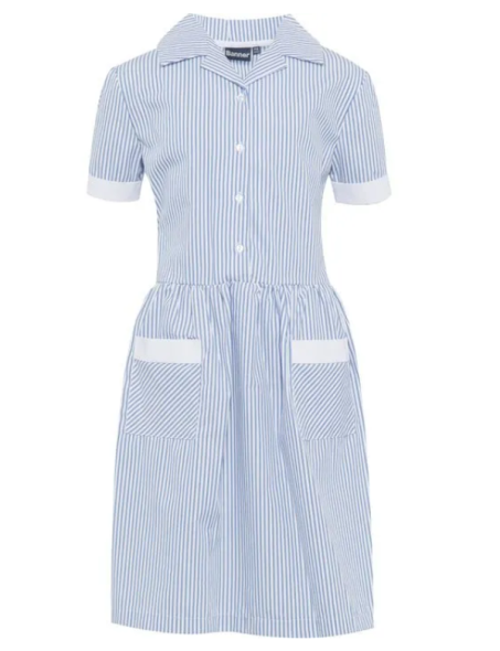 Item: Button front corded stripe dress with contrast white trim on sleeves and pockets.