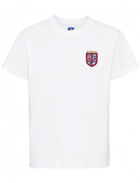 Item: White classic style t-shirt with embroidered St. Mark's Primary logo