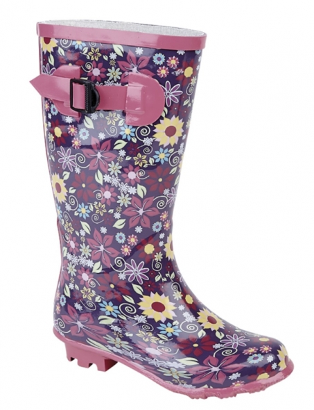 Stormwells Girls Wellington Boots with side strap in pink and mulberry floral.