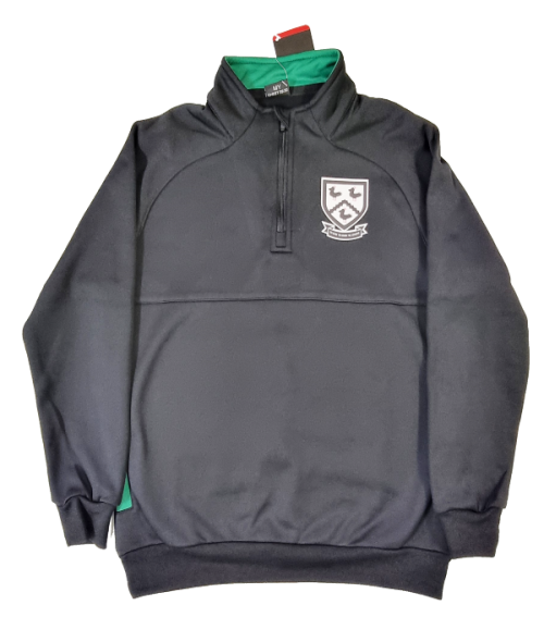 Item: Black CHadwick Quarter Zip Track Top with contrast colour panels and binding and Thomas More logo