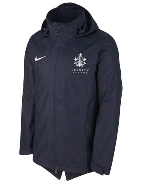 Item: Navy Nike rain jacket with Trinity School logo on front left breast & text across upper back