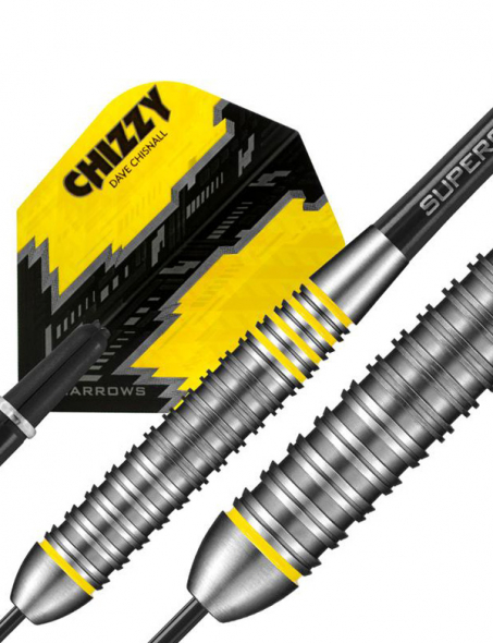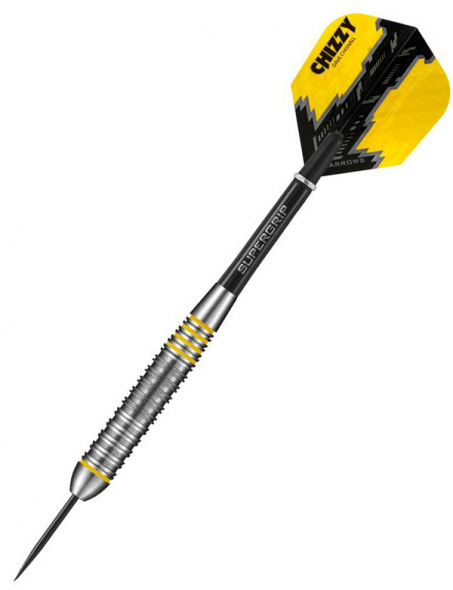 Harrows Chizzy brass darts have the same grip sequences as the 80% model, double shark grips at the front and rear and flat double ringed grips in the mid-section. The dart has been coated with a high-grade alloy, giving it a ‘tungsten look’. Like the 80% model, this dart also has five rings in Chizzy’s signature yellow. The drat is fitted with Black Midi Supergrip shafts and Prime flights.